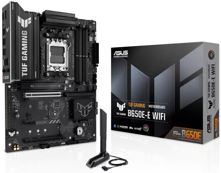 ASUS TUF GAMING B650E-E WIFI takes all the essential elements of the latest AM5 Socket for AMD Ryzen™ Desktop Processors and combines them with game-ready features and proven durability. Engineered with military-grade components, an upgraded power solution and a comprehensive cooling system, this motherboard goes beyond expectations with rock-solid and stable performance for marathon gaming. TUF GAMING motherboards also undergo rigorous endurance testing to ensure that they can handle conditions where others may fail. Aesthetically, this model incorporates rugged off-black and geometric design elements to reflect the dependability and stability that defines the TUF GAMING series. This platform delivers the power and connectivity that advanced AI PC applications demand.