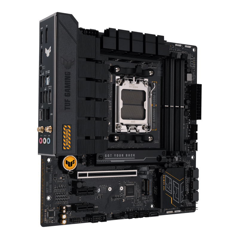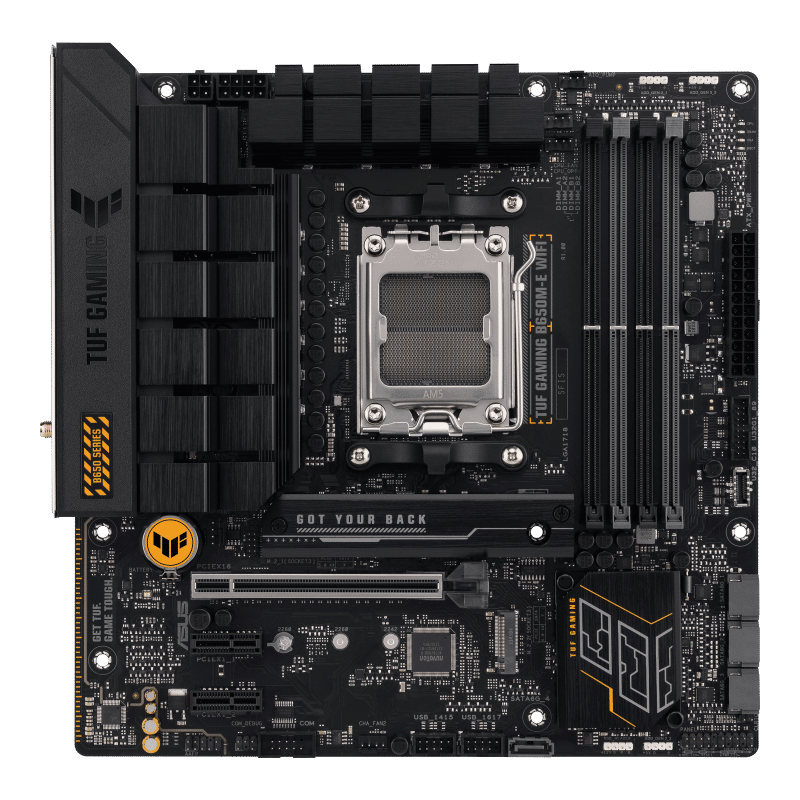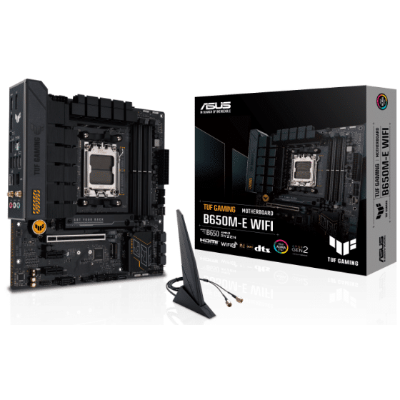 ASUS TUF GAMING B650M-E WIFI takes all the essential elements of the latest AMD Ryzen™ Desktop Processors and combines them with game-ready features and proven durability. Engineered with military-grade components, an upgraded power solution and a comprehensive cooling system, this motherboard goes beyond expectations with rock-solid and stable performance for marathon gaming. TUF GAMING motherboards also undergo rigorous endurance testing to ensure that they can handle conditions where others may fail. Aesthetically, this model incorporates rugged off-black and geometric design elements to reflect the dependability and stability that defines the TUF GAMING series. This platform delivers the power and connectivity that advanced AI PC applications demand.