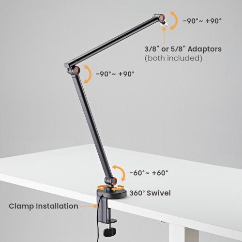 The MDS16-1L RGB Lighting Slim Microphone Boom Arm has an aesthetic form with the RGB lighting effect that brings a sense of design to the working area. Built-in button control for easy lighting mode selection. Compatible with any microphone or shock mount using a standard thread, weighing up to 1kg/2.2 lbs. Cable management included ensures your setup is tidy and its extended reach and rotation make it easy to position your microphone exactly where it needs to be. Make content creation easier and more efficient.