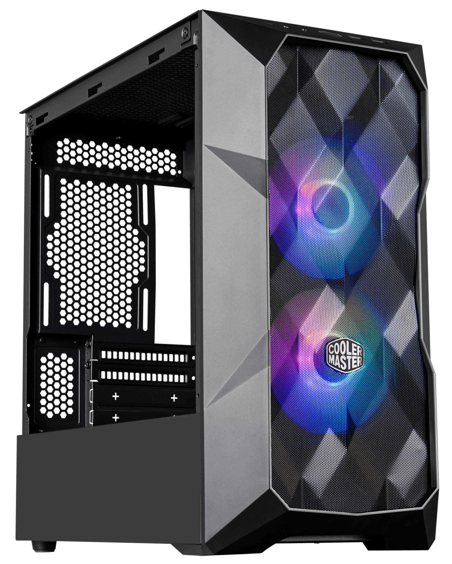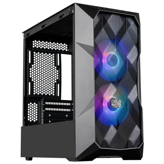 The Cooler Master MasterBox TD300 Mesh brings together modern presentation and performance with its three dimensional artistic mesh front panel. The polygonal diamond-cut facade emphasizes the illumination of two included SickleFlow PWM ARGB fans, cast various glowing effects, shifting based on the viewing angle.